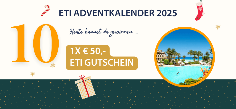 Das 10. Türchen hat sich geöffnet und wir verlosen einen € 50,- ETI Gutschein für deinen nächsten Urlaub!
