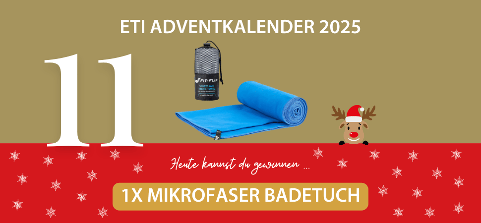 Hinter Türchen Nummer 11 des ETI Adventkalenders versteckt sich ein kompaktes Mikrofaser-Badetuch, das in jedem Gepäck Platz findet. Es ist saugstark und schnelltrocknend uns somit bestens geeignet für einen Tag am Wasser. Ein tolles Badetuch, welches durch hohe Materialqualität überzeugt und ganz einfach in der Waschmaschine gewaschen werden kann.
