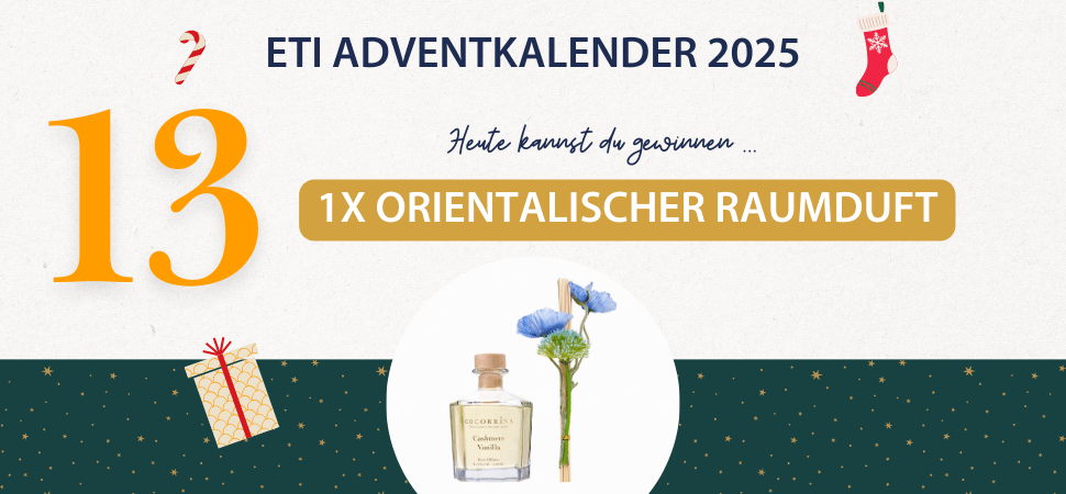 Hinter dem 13. Türchen des ETI Adventkalenders verbirgt sich ein langanhaltender orientalischer Raumduft! Der süße Duft von Vanille ist warm und beruhigend und verstärkt das Gefühl der Gemütlichkeit. Der Diffusor ist mit sorgfältig konservierten Blumen geschmückt, die ihn zu einem eleganten Dekorationsstück für jede Umgebung machen.