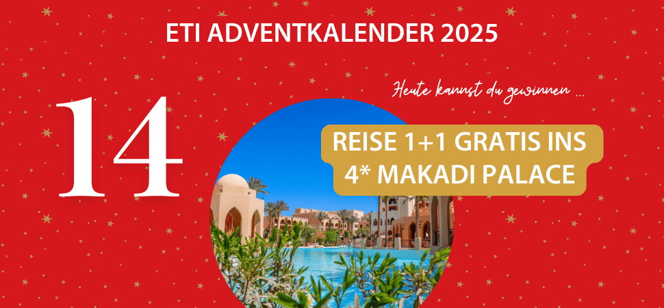 Heute öffnet sich das 14. Türchen mit einem Sondergewinn: Verbringe einen Traumurlaub im 4* Makadi Palace. Eine Person reist zum tagesaktuellen Systempreis, die ZWEITE Person reist GRATIS.
